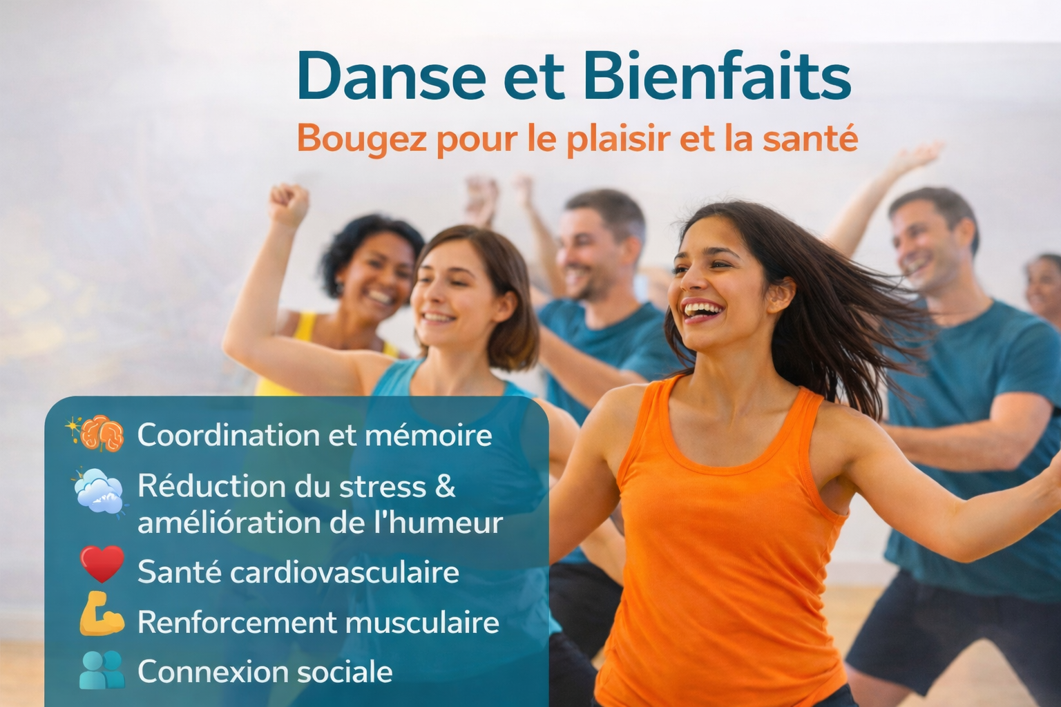 Ressources et Bienfaits La danse peut être une façon de faire de l’exercice sans s’en rendre compte. Plus, encore: elle permet d’améliorer l’équilibre et de réduire le risque de chutes chez les femmes âgées. Voici comment. Cliquez ici -- Danser, pour le plaisir de bouger